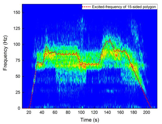 Figure 14 indicates the comparison results between the time-frequency diagram at point D11 and the frequency excited by the wheel polygon. It can be observed that the characteristic frequency of 15-sides polygon (red points in Figure 13) is highly consistent with the dominant frequency of dynamic stress.