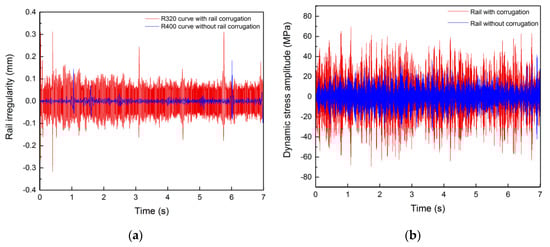 The relationship between rail irregularity and the dynamic stress amplitude: (a) degree of rail irregularity; (b) dynamic stress.