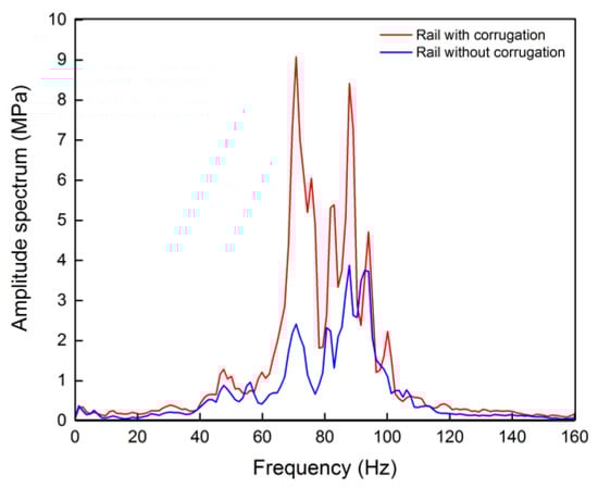 Meanwhile, Figure 18 shows a comparison of the characteristics of frequency domain with and without rail corrugation. It can be observed that in the frequency range of 60–90 Hz, the dynamic stress amplitude with rail corrugation is significantly greater than that without rail corrugation, especially in 71 Hz. In summary, the rail corrugation phenomenon has a significant effect on the dynamic stress amplitude at the cracked area.