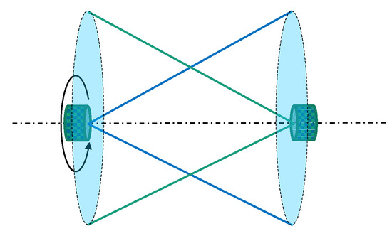 There will always be a misalignment between both transceivers due to positioning, assembly tolerances or vibrations. The rotation axis might even exhibit a nutation, i.e., nonideal motion around the ideal rotation axis. The combination of these nonidealities and the communication distance leads to a minimum field of view (FOV) that is required for robust operation. The FOV sizes are denoted by the half-opening angles and . In order to ensure eye-safe operation, i.e., to classify the system as laser class 1 according to IEC 60825-1:2014 (DIN EN 60825-1:2015-07) [27], the optical transmitter power is limited. Therefore, efficient transceiver design is required to meet link-budget requirements, ensure eye-safety and to maximize data rate. The designer tries to maximize the dynamic range by keeping the TX and RX performance constant within a plane perpendicular to the optical axis [28]. In other words, TX has to provide constant irradiance and RX has to detect the same signal level within this plane.