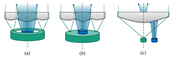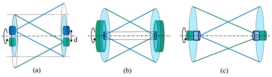 Schematic illustration of arrangements of separated TX (blue) and RX (green). (a) TX and RX are placed next to the rotation axis. The FOV of TX and RX overlap only partially. (b) TX and RX are placed at the optical axis and they are separated in radial direction. (c) TX and RX are placed in a line along the optical axis and the front element is transparent.
