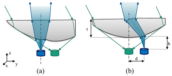 Approach (a) is used by commercial low data rate IrDA transceivers like Vishays TFBS4711 [33] but also by a high-speed transceiver demonstrated by Faulwaßer et al. [34]. The axis of rotation is placed trough one of the elements or between them. This leads to misaligned FOVs. The designer tries to minimize the spacing d. Next, both FOVs are chosen large enough to ensure a sufficient . As we learned from Equation (4), scales with and . This penalty is typically significant. A numerical example is given in Section 3.