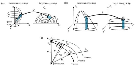 In contrast, direct calculation algorithms follow well-defined design procedures and yield deterministic outcomes. Thereby, they provide better results than numerical optimization methods [38], especially if the systems are complex. A great variety of design methods are known, for example ray mapping [39,40,41,42,43,44,45,46], forming surfaces using Cartesian ovals [47], the simultaneous multiple surface method in 2D [48] and 3D [38,49] or the tailored freeform design method proposed by Ries and Muschaweck [50]. Nowadays ray mapping approach, i.e., the combination of energy mapping in conjunction with geometrical surface construction, is in the focus of illumination research [39,40,41,42,43,44,45,46]. Here, a mass-transfer problem is solved by transforming the source power irradiance into the target power irradiance . This transformation is represented by a mapping from the source domain to the target domain . Then, the laws of refraction and reflection are applied for points to calculate a corresponding vector field containing the surface normals with , . The challenge is to find a mapping which yields a vector field that satisfies the integrability condition for a continuous surface. This condition is shown in Equation (6) [41,42,50]. It states that has to be curl-free or exhibit at least minimum curl.
