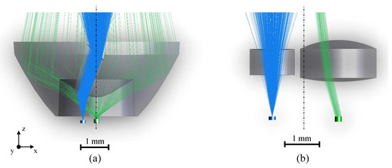 Figure 4. Ray path in the hybrid lens system. (a) Center TX (blue) and off-axis RX (green). (b) Center RX and off-axis TX. - The PD is placed centrally and the emitter is positioned off-axis as shown in Figure 4b. The TX lens part fulfills two tasks: first, it compensates the displacement of the ray bundle regarding the optical axis. Second, it reshapes the ray bundle to the anticipated FOV. Because two surfaces are required, the top aperture of the lens cannot be flat. On the other hand, the design of the RX lens part is simplified, because the focal point is on the optical axis. If the TX part is neglected, the RX lens can be designed to be rotationally symmetrical. However, the shadowing effect of the TX part introduces a nonrotationally symmetric factor. Theoretically, this can be partly compensated by a nonrotationally symmetric RX lens part. The shadowing effect is also mitigated by minimizing the size of TX.