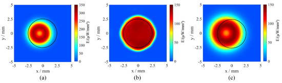 Irradiance over . (a) For the LD without any optics (LD). (b) For the LD with the hybrid TX-RX lens. (c) For fully separated TX and RX. The black circle highlights the anticipated TX FOV. Note the different color bar scales for the subfigures.