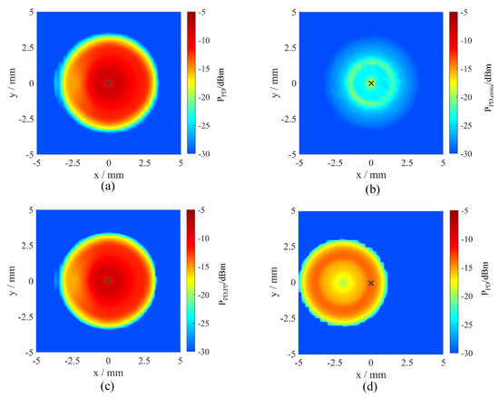 Incident power and over misalignment at . The ”x” marks the axis of rotation. (a) for the hybrid lens. (b) for the hybrid lens. (c) for the hybrid lens. (d) for the system with fully separated TX and RX (Section 2.3) in worst-case orientation, i.e., TX lens facing TX lens and RX lens facing RX lens. Note: The graphs are clipped below dBm to highlight features within the FOV. Therefore, cannot be seen in Figure 8b.