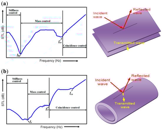 Several studies of transmission loss for sandwich and composite DPS have revealed various important regions [33]. However, the transmission loss characteristics curve can be generally divided into three regions—the stiffness controlled region, the mass controlled region and the coincidence controlled region [34,37,38,39,40,41] as depicted in Figure 1. From the figures, the stiffness controlled region emanating from the origin to the first resonance for flat plate or the transition resonance for cylindrical or curved shell, is seen as a falling STL curve in the low frequency region. The region of the curve between and for flat or rectangular structure is the mass controlled region. This curve is typically seen as a rising curve and is controlled by the mass law [42]. In some special cases, for flat or rectangular structure, as the stiffness of the material decreases, a damping controlled region could be observed [43,44]. Moreover, the mass-controlled region is also observed by the cylindrical or curved structures but they are within the and regime as depicted in Figure 1b. The coincidence controlled region is the region of the curve after the coincidence frequency for most flat or rectangular structure. However, this region begins from for cylindrical or curved structures. It could arise when there is a coincidence between the structural and acoustic wavelengths. Apart from these common controlled regions, some authors have described other kind of regions which may exist between the stiffness controlled and the mass controlled regions. For examples, between these regions, Zhang and Du [45] described the STL of a flat plate to have a few-mode region while Oliazadeh and Farshidianfar [46] described a resonance controlled region of the STL for cylindrical shells.