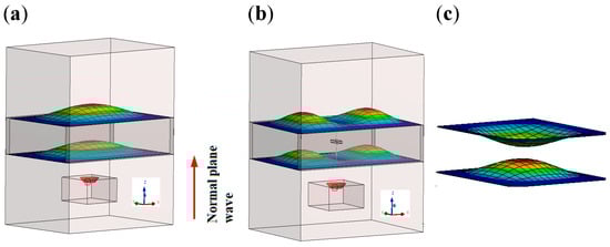 Finite element simulation results of double panel enclosed air cavity structure (a) first vibration mode of mass–air–mass (MAM) system (b) first vibration mode of mass–spring–damper (MSD) system (c) vibration mode at MAM resonance.