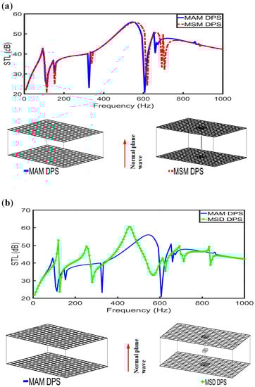 Double panels with enclosed air cavity may be regarded as the simplest or pseudo form of an equivalent sandwich structures for vibro-acoustic application. Transmission loss results obtained from this equivalent double panel structure can be used as a basis for comparison of the STL results obtained from sandwich core structures. The enclosed air cavity between the two panels allows the transmission of sounds from one panel to the other and has been described to be equivalent to a mechanical spring [49]. It is worthwhile to note that the use of mechanical spring between the panels of the enclosed air cavity or the mass–air–mass (MAM) region of the DPS, reduces their STL especially in the mid and high frequency region. To validate this statement, the authors of the present study performed a finite element simulation of double panel walls with enclosed air cavity of density and speed of sound . Each panel is simply supported with length 350 mm, width 220 mm and thickness 1 mm. The density, Poisson ratio and Young’s modulus of the panels are 2814 , 0.33 and 71 GPa, respectively. The effects of spring and damper mechanisms are investigated and the results are compared with double panels without spring and damper effects as given in the finite element results of Figure 2a,b. With spring mechanism connected to the double panels, it is evident that the vibro-acoustic response deteriorates and the response is almost similar to the double panels with enclosed air cavity as shown in Figure 2a. Moreover, a careful inspection of the obtained result shows that at a particular frequency close to the resonance frequency, for the DPS with enclosed air cavity, the two panels move in opposite phase which results in a mass-air-mass resonance as shown in Figure 2c. In addition, at resonance dip frequency, the STL of the MAM mechanism is higher than the mass–spring–mass (MSM) double panel mechanism as seen in the STL curve of Figure 3a. In addition, before the resonance dip frequency, it is seen that the STL of the two mechanical structures follow the same trend. The introduction of spring, therefore, increases the stiffness in the enclosed air cavity region. Thus, the result shows that an increment in the stiffness of the cavity or core of DPS undermines the effectiveness of the structure to reduce noise. To improve the STL of DPS with spring connection in the low frequency region, it is necessary to convert the structure to a mass–spring–damper (MSD) system [49]. Figure 3b shows the STL comparison between the MSD system and those obtained from MAM system. It is evident that at some low frequency range, the STL of the MSD system was increased by more than ten percent of the MAM and MSM systems. However, in the mid-high frequency zones (i.e., 900–1000 Hz), there is no improvement of the STL of MSD system and therefore, it can be seen to behave like the air cavity and spring connected DPS.