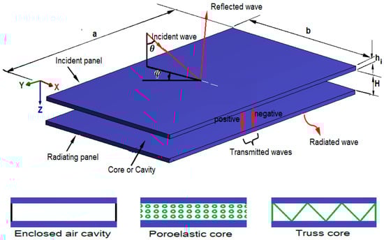 The reduction of noise through vibro-acoustic panels has become an interesting area of research in the past few decades. Single and double wall structures have been used for sound insulation purpose and in various applications such as in the aircraft, automotive, marine and building industries [1,2,3,4,5,6,7]. The double panel structures (DPS) have gained popularity over their single panel counterparts owing to their better sound insulation properties and industrial applications over a wide frequency range. Moreover, their vibro-acoustic characteristics can still be improved to give better sound absorbing performance. For example, the DPS have been sandwiched with various interlayers and absorbing materials to improve their sound insulation performance [8,9]. Sandwich structures are low weight and high strength structures which consists of two parallel panels, sheets or laminates bonded to a core or having a cavity between them. The panels which are typically known as the skins or face-sheets can be made from different materials such as metallic, composite or their hybrids. Moreover, the cavity or core between the two face-sheets can be architecturally supported or/and filled with some sound insulation materials [4,8]. In this way, optimal double panel structural design can be adopted for different applications. A very important vibro-acoustic index used to characterize sandwich and composite DPS is the sound transmission loss (STL). This is the ratio of the sound power incident on the incident panel to the sound power transmitted by the radiating panel. During the investigation of vibro-acoustic emission, sound waves impact the incident panel, transmit through the cavity/core and eventually emit from the radiating panel as depicted in Figure 1.