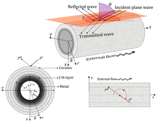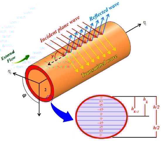 These types of sandwich double wall structures have also attracted attention in the aerospace and marine industry. Their practical application has been seen in the construction of sandwich composite fuselage [59,77]. In the previous subsection, the flat sandwich composite structures were assumed by researchers to have finite structures. However, in the calculation of the STL for the cylindrical composite shells, they are mostly assumed by researchers to be infinitely long. A good number of contemporary authors have investigated the effects of various parameters on the STL of cylindrical sandwich composite shells. Daneshjou et al. [68,78] obtained analytical solutions of STL of composite cylindrical shells and the effect of angle of wrap, shear and rotation of the shells on the STL were in investigated. In their findings, the STL of the composite shells were influenced by the angle of wrap of the layers. However, in the high frequency region, a decreased STL was observed due to the effect of shear wave transmitted but this effect was insignificant in the low frequency region. Talebitooti et al. [69] also analytically obtained the STL of composite cylindrical shell using third order shear deformation theory. The schematic representation of the structure is seen in Figure 6. The authors investigated various parameters such as stacking sequence, Mach number, shell radius, shell thickness, material types and Young’s modulus. In their investigation, there was significant effect of the STL when different composite materials were used. The STL evidently increased with shell thickness at low, medium and high frequency zones. Moreover, with increased Mach number and shell radius the STL was seen to decrease especially in the low frequency region. Furthermore, the stacking sequence that involved more zero degree plies were noticed to give better STL. In addition, they also compared the STL results between the composite cylindrical shell and aluminum cylindrical shell. It was seen that the latter gave higher STL than the former in all the controlled regions, i.e., stiffness, mass and coincidence regions. The reason for the higher STL of aluminum cylindrical shell is because it has higher density than their composite cylindrical shell counterpart.
