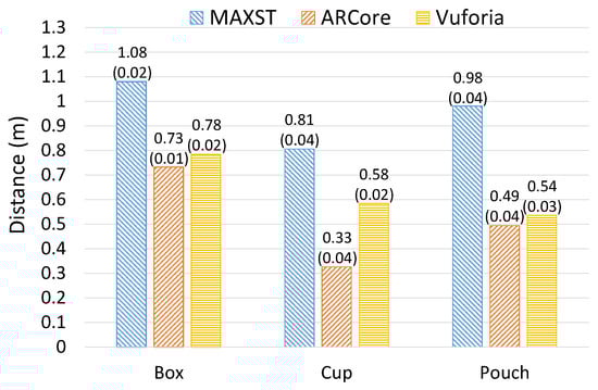Figure 5, MAXST achieves the longest average distance while ARCore shows the shortest average distance for the maximum recognizable distance. In addition, we can see the difference among the product types. In the case of MAXST, the distance varies from 0.806 m to 1.08 m on average. Vuforia shows a distance from 0.536 m to 0.784 m on average, while that of ARCore is from 0.326 m to 0.732 m. The box-type product with MAXST shows the longest distance of 1.08 m and the cup-type product shows the shortest distance of 0.326 m with ARCore. The package of the cup-type product is curved and its target image size is relatively small, so the distance is shorter than that of other products.