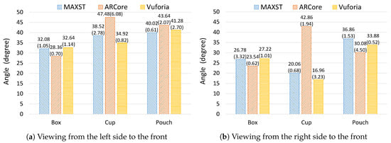 For the minimum recognizable viewing angle, there are no noticeable differences among the three AR frameworks, except for the cup-type product. The average minimum angle is 31.2 degrees (SD: 7.8 degrees) with Vuforia, which is the smallest. That of MAXST is 32.4 degrees (SD: 7.3 degrees), while ARCore shows 36 degrees (SD: 9.6 degrees). As shown in