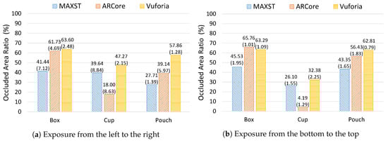Figure 7). It is able to recognize the product even when the hidden target image area is 54.5% on average (SD: 11.6%). The average ratio of ARCore is 40.9% (SD: 23.5%), while that of MAXST is 37.3% (SD: 9%). Similar to the previous results, the cup-type product shows low performance compared to other products.