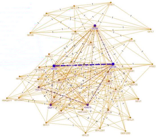 This study used level-4 CPC as a basis for the critical SOA technology network analysis. The network model results are displayed in Figure 1, and the key CPC results are presented in Table 3. Every patent can belong to multiple CPCs (nodes), and the value of 1 between different CPCs means that the number of appearances in the same patent is 1. The larger the value between two CPCs is, the stronger the technology correlation between the CPCs is. Consequently, the relations between CPCs (nodes) and patent numbers (sides) can be used to construct a technology network, as presented in Figure 1. The participants in the center of the technology network can be considered key nodes, that is, nodes with high attention.
