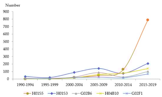 This study analyzed the patent changes in the H01S5, H01S3, G02B6, H04B10, and G02F1 critical technologies to understand the trends in SOA technology. The analysis results are displayed in Figure 2. One patent can belong to multiple CPCs. Figure 2 presents the number of patents in each era that belong to the five critical technologies.