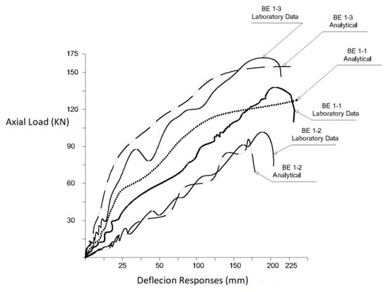 Table 1 also provides specifications of the columns under a concentric compression load, which are mentioned as AX-1-1, AX-1-2 and AX-1-3. All these three full-scale column specimens have comparable geometry specifications. The height of these columns was almost 1 m. Ultimate axial and bending capacities of these full-scale column specimens under concentric loads are reported in Table 1. The average accumulated axial load-strain response of the columns is presented in Figure 4. The results were based on the mean value of three installed strain gauges to control the displacements in these columns. Figure 4 also desalinated the comparison of the results with the idealistic axial-strain behavior following the lamination theory. Linear stress-strain behavior of the GFRP piles is simulated following a linear regression based on the results of this experimental study. The distribution of the forces in the GFRP tube along with concrete material was measured using numerical integration. The internal moment capacity of the pile was predicted at various strain levels using these calculated forces. The verification of the material is explained in the following section.