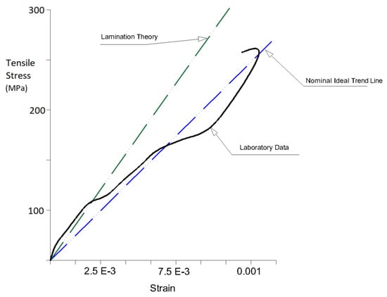 Comparison of axial stress–strain based on laboratory data, the lamination theory, and an ideal hypothetical line. The GFRP material properties are as shown in Table 2, compressive strength of the concrete in the pile: 30 MPa.