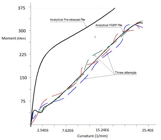 Figure 5 depicts the curvature-moment responses of the GFRP piles for the three geometrically similar eccentrically loaded column specimens. The crack moment, 43 kNm, is considerably small compared to the ultimate bending capacity of the specimens. An immediate drop in the bending capacity of the columns is recorded which is the result of the stroke control test after occurring the crack. An analytical comparison is conducted between the responses of the GFRP composite piles and pre-stressed piles filled with concrete. A prediction of curvature-moment response of the pre-stressed piles was calculated following the strain compatibility and equilibrium theory. Details of such an analytical model is available in the previous research studies []. The Ramberg–Osgood equation was used to simulate the relationship between strain and strain responses of the pre-stressed strands. To simulate the nonlinear stress-strain behavior of the concrete in the pile reinforced with these pre-stressed steel material, a generalized expression model by Popovics [] is used. This predicted curvature-moment response of the pre-stressed concrete filled pile is shown in Figure 5 for analytical comparison purposes. ACI 318M-19 Standard and AASHTO LRFD bridge design specification limited the ultimate useable compressive strain to 0.003, for the conventional plain concreter with limited ductility [,]. Following these standards, the same ultimate maximum strain of the concrete is used in the prediction of the responses of the pre-stressed piles filled with concrete material [].