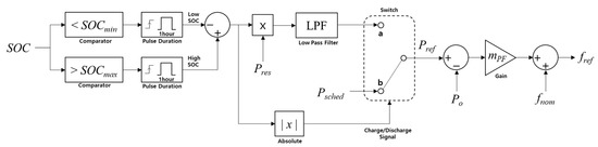 As shown in Figure 1, the SOC signal enters into the comparators, which check whether the SOC drops below SOCmin or exceeds SOCmax. If one of those events occurs, the output of the comparator triggers the pulse and generates ‘1’ as the duration, which can be adjusted by the operator. Here, the duration is set as 1 h since the tertiary control time interval of Psched is also considered as 1 h. This time interval can be adjusted by the operator. If Psched is changed, the pulse (low/high SOC signal) is designed to be turned off so that the microgrid can be operated as scheduled data. Note that the output of the add/subtract component, ‘−1’ (low SOC signal) or ‘+1’ (high SOC signal) or ‘0’, will be multiplied by Pres. Since the low/high SOC signal is a step signal, Pres multiplied by the low/high SOC signal enters into the low-pass filter (LPF) to alleviate any step change. Otherwise, a large step change of fref occurs and may result in instability of the system. The switch shown in Figure 1 chooses node ‘a’ or ‘b’ to provide an active power reference as low-pass filtered Pres or Psched, respectively. The selection of the node is determined by the ‘charging/discharging signal’ shown at the bottom of Figure 1. Hence, Pref can be expressed as: