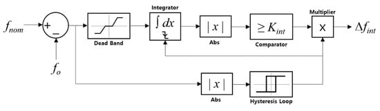 The core part of the grid-feeding DG’s active power controller is the process of generating the ∆fint signal, which is shown in Figure 3: the frequency deviation signal goes into the integrator through the dead band block, which prevents too-frequent activation of the ∆fint signal; hence, it tolerates a small deviation in the frequency. The absolute value of the integral of frequency deviation is compared to a certain constant value, Kint, to determine whether or not to restore the frequency. Note that the integrator is used to reflect not only the time, but also the magnitude of the frequency deviation. Kint can be adjusted by the system operator. By decreasing Kint, the frequency can be strictly adjusted to the nominal value but the output of the grid-feeding DG unit will be changed too frequently. The output of the comparator is multiplied by the output of the hysteresis loop, which yields ‘1’ or ‘0’. Hence, ∆fint will be set to ‘1’ to turn on the “PI On/Off switch” in Figure 2, only if both the comparator and the hysteresis loop outputs are ‘1’ will the “PI on/off switch” be on; otherwise, it will be turned off. The hysteresis loop plays a key role in turning off the switch. It outputs ‘1’ when the absolute value of the difference between fnom and fo exceeds a certain value, and outputs ‘0’ if the frequency difference is restored back to a certain other value. For instance, if the former and the latter values are 0.1 and 0.01, respectively, the hysteresis loop outputs ‘1’ if the absolute frequency difference exceeds 0.1 Hz, and outputs ‘0’ if the absolute frequency difference is restored back to 0.01 Hz. Once the hysteresis loop outputs ‘0’, ∆fint becomes ‘0’ and the integrator is reset. Without the proposed hysteresis loop control, secondary control without communication cannot be implemented. The parameters used in Figure 2 and Figure 3 are shown in Table 3.