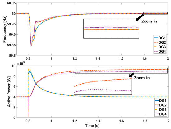 As shown in Figure 5, the frequency drops at 0.8 s due to the load increment. Focusing closely on the zoom in part of the frequency, a measured frequency error among DGs can be observed. The active power of the grid-forming units immediately follows the load change at 0.8 s and hence changes their output frequency. Since grid-feeding units adopt an integral controller to restore the frequency, their active power increases after frequency deviation. However, even after the frequency is restored back to nearly 60 Hz, the active power of DG2 and DG4 does not remain as the steady-state value, but is instead increased and decreased, respectively. This is due to the measurement error, which exists in the real world. Since DG2 and DG4 measure smaller and larger values than 60 Hz, respectively, they keep increasing and decreasing the active power, respectively. Eventually, the system will collapse. Furthermore, if there are set point errors in frequency reference and/or controller gain, the system frequency will not be maintained at a steady-state value.