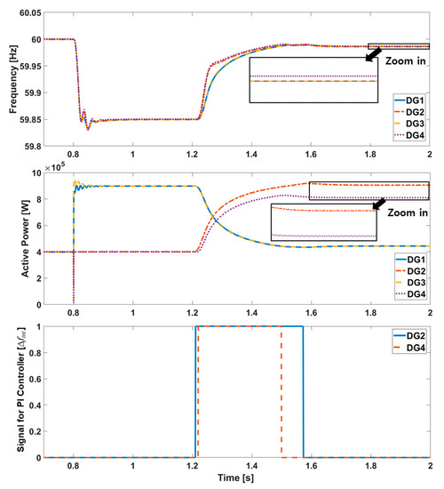 In Case 1, two different control methods for frequency restoration are compared. They adopt an integral controller and the proposed controller, respectively, for grid-feeding units for frequency restoration. The purpose of this case is to test whether the grid-feeding units restore the frequency without causing any problems, such as the hunting effect, while frequency measurement error among grid-feeding units is simulated. To simulate this measurement error, 0.001 Hz is added to the frequency measured by DG4. The load is changed after 0.8 s of the simulation to cause a frequency deviation. Figure 5 shows the simulation results achieved using an integral controller.