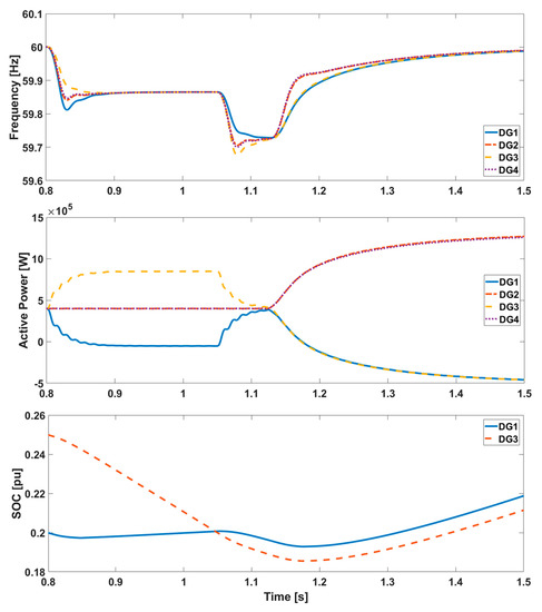 Unlike Case 2, the SOC may not always be identical among ESSs. In Figure 8, simulation results are shown to illustrate the performance of the proposed controller while the SOCs differ among grid-forming units. Here, the SOC of DG3 is 1% larger than that of DG1. At 0.8 s, the SOC of DG1 drops below SOCmin (20%) and the output frequency drops due to the change in Pref. However, the SOC of DG3 is still above SOCmin immediately after 0.8 s, and DG3 does not change its Pref. Therefore, the two grid-forming units instantaneously output different frequencies. Since DG1 outputs a lower frequency than DG3 at 0.8–0.86 s, the output powers of DG1 and DG3 are decreased and increased, respectively. Consequently, the SOC of DG3 drops faster, and finally drops below 20%. At 0.99 s, ∆fint of the grid-feeding units is turned on and the frequency and SOC are restored.