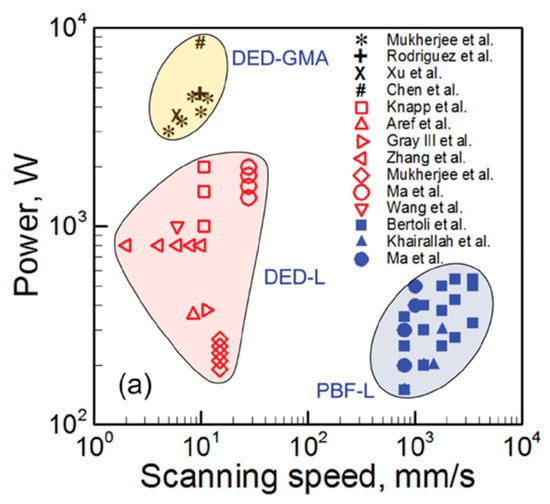 Arc power and scanning speed of WAAM (also called DED-GMA), DED-L, and PBF-L processes for 316 stainless steel [].
