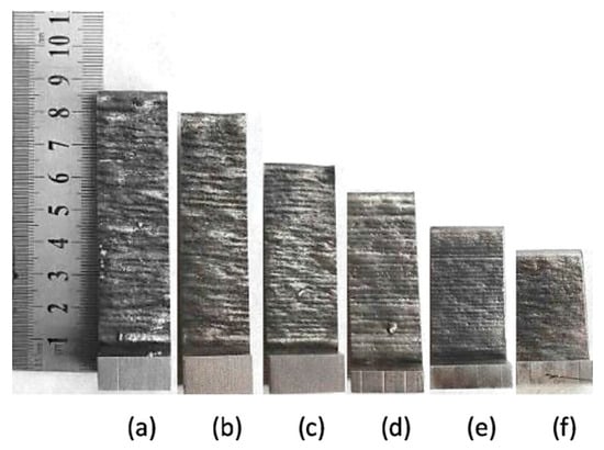 Wu et al. [] studied the influence of the bottom current mode, scanning speed, and interlayer cooling time on the macro morphologies of 316L stainless steel samples using MIG (metal inert gas) welding additive manufacturing. The process parameters of different samples are listed in Table 4. As presented in Figure 3, there were no significant defects between the layers of the samples. A thin and tall sample, G3010 (gradual reduction of bottom current, scanning speed was 30 cm/min, cooling time was 10 s), had uniform layer height, as demonstrated in Figure 3a. Through the samples in Figure 3b, Wu et al. [] found that gradual reduction of current improves bottom formation.