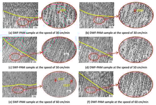 Feng et al. [] investigated the microstructure in the adjacent area between the 35th layer and 36th layer of DWF-PAM and SWF-PAM processed parts (Figure 6). They pointed out that increased scanning speed can produce better grain structures (finer complete grown equiaxed ferrite (CGEF) grain structures), and two wires melting in the same melt pool can augment the cooling rate, resulting in the formation of a finer complete grown equiaxed ferrite (CGEF) grain structure. As shown in Figure 6, as the scanning speed increased from 30 cm/min to 60 cm/min, the number of complete grown equiaxed ferrite (CGEF) grains significantly increases in DWF-PAM samples. However, in SWF-PAM samples, there are some incomplete grown equiaxed ferrite (IGEF) grains when the scanning speed increases from 30 cm/min to 50 cm/min. As the scanning speed increases to 60 cm/min, the IGEF grains quantity reduces, and only a few CGEF grains appear. Due to the CGEF grains distributed in the interface region adjacent to next layer, the ultimate strength of DWF-PAM samples is higher than that of SWF-PAM specimens. The ultimate tensile strength of DWF-PAM samples increases by an average of 10.2%, roughly by 52.98 MPa, when compared with those of SWF-PAM specimens [].