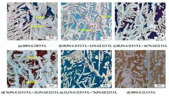 Micrographs of the structures fabricated with different mixing ratios at 500 x magnification, taken in layer 10, etching: Beraha II, white: austenite, blue/brown: ferrite []. (WAAMed duplex stainless steel components by mixing two different filler metals)