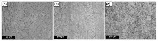 Table 7 summarizes the microstructure, tensile strength, yield strength, and elongation of stainless steels manufactured by different WAAM technologies. The process factors affecting microstructure and mechanical properties are listed in Table 7. The microstructures of a H00Cr21Ni10 stainless steel part prepared by DWF-PAM are illustrated Figure 5 []. Owing to different heating state and thermal cycles in different areas of the deposited samples, the microstructures are characterized by three different regions: the top, middle, and bottom sections. The macrostructure, microstructure, and mechanical properties of the middle section are critical to the manufactured components. As presented in Figure 5b, the ferrite (δ-Fe) phase are embedded on the fine austenite matrix and each layer consists of a sequence of fine grain (C), columnar grain (B), and equiaxed grain (A) regions from the bottom to the top. In SWF-PAM samples, the above microstructures were also observed.