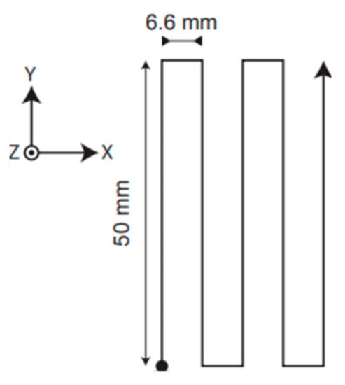 There are several types of distortion in WAAM parts, including bending deformation, shrinkage in the longitudinal and transverse directions []. The repeated heating and cooling can cause thermal expansion and shrinkage of the deposited parts, leading to deformation, especially in large thin-walled components []. Residual stresses and distortion are closely related to deposition paths in WAAM [,]. Lee et al. [] reported that a bidirectional tool path with 180° rotation decreased the residual stress by around 50% at the bottom corner of the sample, which potentially reduces the cracking susceptibility. When fabricating martensitic stainless steel samples by the oscillation pass (Figure 9) [], high distortion occurred in the substrate because of high heat input, as shown in Figure 10. Gordon et al. [] reported that when deposition path was one-direction from left to right, the residual stresses resulted in a distinctive curvature of a single-bead wall, which can be seen in Figure 1 of []. The cooler left-end at the beginning makes the sample beginning a little higher than desired. However, the right-end of the build is lower than anticipated, because residual heat from the previous deposited layers causes the metal to flow more []. In general, proper deposition paths can notably reduce residual stresses and deformation, particularly in large scale WAAM fabrication [,].