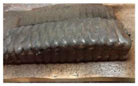 The surface of CMT- base additive manufacturing parts is rather smooth as mentioned by the work of Fronius International GmbH [,], Bruckner et al. [], Zhang et al. [], and Pickin et al. []. To investigate the ability of CMT in terms of surface condition, Posch et al. [] adopted CMT to manufacture blade-like geometries of duplex stainless steel. With consistent welding parameters for all layers, they achieved quite smooth surface comparable to that obtained by hot rolling, flame cutting, or sand casting. The absolute surface roughness (Ra) of duplex stainless steel geometry was 24.5 μm, and the average distance between the highest peak and lowest valley (Rz) was 135.3 μm, which can be seen in Figure 4 of [].
