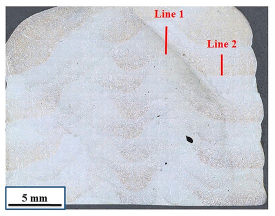 Typical cross-section of WAAM type-2205 duplex stainless steel samples. The brighter area contains more austenitic and the darker more ferritic. A pattern may be seen in the deposited sample, where lines 1 and 2 represent the brightest and darkest etched regions, respectively [].