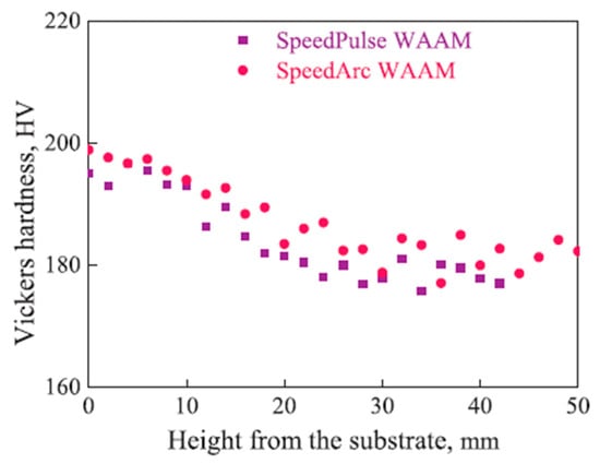 Hejripour et al. concluded that duplex stainless steel (wire 2209) WAAM-made parts had a lower hardness value than the base metal (a 2205 duplex stainless steel substrate) due to the lower ferrite content in the layers []. According to Wang et al., the Vickers hardness values of 316L stainless steel components exceed 175 HV, obtained by both SpeedArc (the primary metal transfer mode is the short-circuited transfer mode) and SpeedPulse (the primary metal transfer mode is a projected spray transfer mode) additive manufactured process [], as shown in Figure 12. Though scanning speeds and deposition rates are the same for both processes, the SpeedArc WAAM can provide a more exceptional solidified structure (smaller secondary dendrite arm spacing) in the deposition parts owing to a lower heat input and higher cooling rate. As a result, the hardness values of SpeedArc WAAM parts are higher than those of SpeedPulse WAAM parts. However, this article does not address the hardness distribution of different layers of the same component.