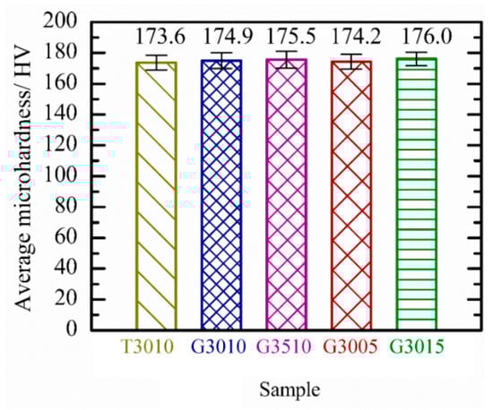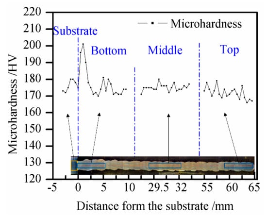 Wu et al. found that the hardness value of the 316L stainless steel sample reduced slowly from the bottom to top because of the heat accumulation. As described in Figure 13, the average hardness in the bottom region ranges from 177.9 HV to 182.75 HV, which is slightly higher than that in the top region, i.e., in the range of 169–174.35 HV [].