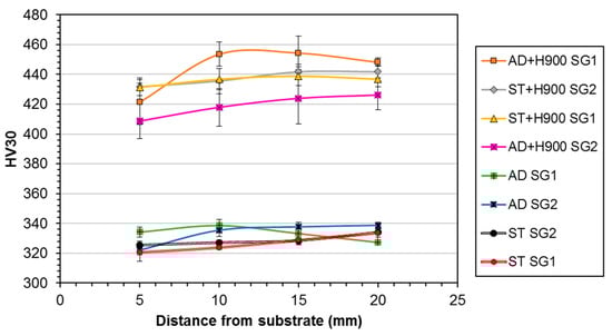 On the other hand, process parameters—such as the transient and gradual reduction of bottom current, scanning speed, and cooling time—have little influences on the hardness of the deposited samples. As seen in Figure 14, there is no significant difference in hardness values between different samples (316L stainless steel) []. In the study of Feng et al. [], the scanning speed also barely affect the hardness of WAAMed stainless steel samples (H00Cr21Ni10 stainless steel) (see Figure 13 in []). However, the average microhardness values of samples G3510 and G3015 are slightly higher than that of others, since these two samples have relatively small heat inputs []. As reported by Caballero et al. [], post processing heat treatment could adjust the final hardness of WAAM 17-4 PH stainless-steel components., specimens underwent H900 ageing treatment (AD+H900 and ST+H900) have higher hardness than the ones treated without further ageing (as presented in Figure 15 []). The maximum hardness value acquired for H900 ageing treatment is 448 HV30, while the maximum hardness value obtained for AD or ST treatment is about 340 HV30, the hardness value increased 32% after heat treatment [].