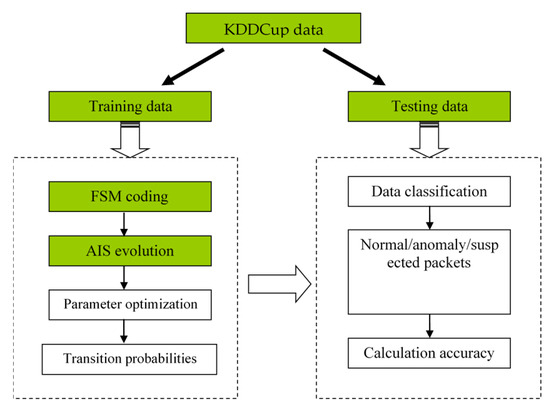 Procedures for the intrusion detection experiment. A dataset is divided to training and testing sets. The training set is used to adjust transition probabilities of FSMs via AIS according to known attack types. The testing set is used to calculate classification accuracy of trained FSMs by pretending that the attack types were unknown.