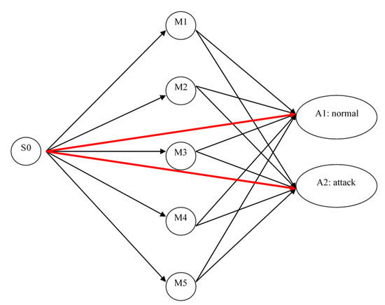 State and state transitions for the FSM of intrusion detection. Some attacks are easy to be captured, and, therefore, the red lines represent direct transitions to final results. Some attacks are elaborate. We have to wait for subsequent information to make the final decision. Each internal state M1–M5 corresponds to one suspicious attack. The number of states depends on the system resources.