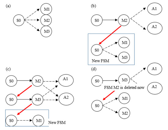 (a) An FSM tracking M1–M3 is initialized; (b), (c) new FSMs spawned when other intermediate attack types are encountered; (d) the FSM tracking M2 is abandoned after packet count t.