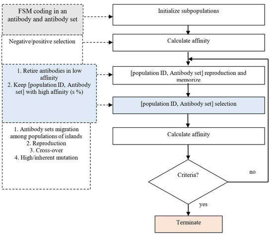 The antibody sets migration between populations of islands. The best solution is rendered by keeping migration with good antibody sets in different islands to exchange and substitute with part of antibody sets in other populations over time. The migration will be selected according to a predefined probability (migration rate).