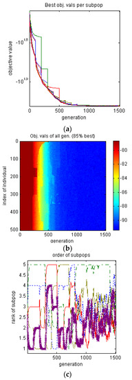The convergence of the IGA evolution. (a) The changes of the best affinity in selected five populations among the 1500 generations are shown by the different colors (the thick red line is the best affinity for all populations). Evidently, affinity has gradually converged after 1000th generations. (b) The best affinity changes of antibodies are displayed in 3D heat map. (c) The affinity changes among the populations before 500th generations are fast, and the rate becomes moderate after 500. Slowly converged population may also produce the best affinity antibody due to the IGA migration mechanism with antibody exchange. After 1000 generations, the affinity between populations become indifferent.