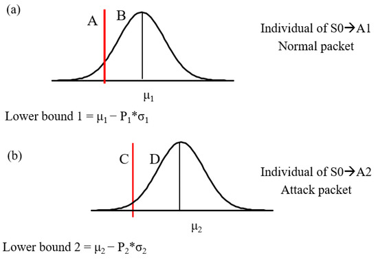 Attack judgment for antibody affinity. The red lines are the lower bounds of antibodies. (a). When the affinity between the packet and antibody is greater than that of the lower bound 1 (B) and less than that of the lower bound 2 (C), the packet can be determined to be a normal packet. (b) If a packet is (A) and (D) on the same time, it is an attack packet.