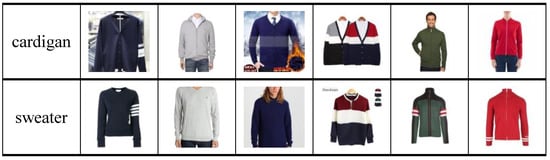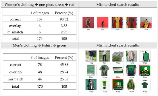 Table 7, respectively). Additionally, each clothing category was crawled separately for five colors. Because there were numerous redundant and misclassified images, we first collected 2500 images for each sub-category. Then, duplicated images were deleted by a program. Among the total 67,500 obtained images, 28,035 images were identified as duplicates and removed. Furthermore, miscategorized images were manually removed by human operators. In particular, 677 images were not related to clothes, and 8922 images were misclassified. After these were removed, 29,866 images remained. The accuracy was calculated after the elimination of misclassified and redundant images. We did not consider duplication as an incorrect result. Excluding redundancy, the accuracy of the crawled images from the shopping mall was approximately 75%, as indicated by