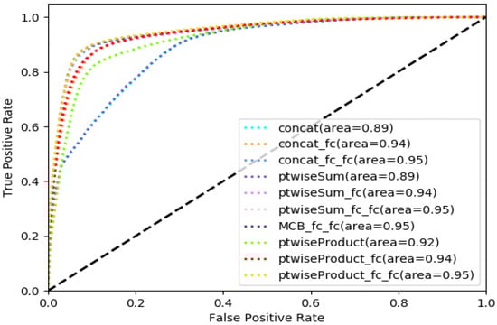 Table 9. The performance of each combination is indicated by the area under the curve (AUC). The x- and y-axes of the ROC curve have a range of [0, 1]. An AUC closer to 1 (closer to the top-left corner) indicates better performance. An AUC of < 0.5 indicates a value-less test. The concat and ptwise sum combinations exhibited the smallest AUCs, and the ptwise product combination exhibited the largest AUC.