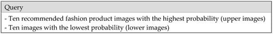 Figure 7 shows the template for the search results. The 10 apparel images with the highest probability corresponding to the user query were retrieved from the test dataset and displayed sequentially, and the 10 images with the lowest probability were also selected and displayed. The