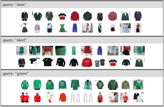 Figure 8 shows the results of fashion product retrieval in the case of a user query with a single keyword. The first example shows the search results for the query term “men”. The 10 best matches include shirts, suits, and hoodies that men usually wear. In the 10 matches with the lowest probability, there are clothes that only women wear (e.g., a dress). For the second example (i.e., the query term “skirt”), the top 10 matches include women’s skirts. On the other hand, the 10 worst matches include men’s apparel. Finally, in the case of the query term “green”, all the best matches are green fashion products, regardless of gender. Conversely, the worst matches are red or white fashion products. This is because the distance between the green and red in the image color space is large. The distances among green (0, 255, 0), red (255,0,0), and white (255,255,255) are larger than the distances of these colors to black (0,0,0). Even the color blue has a large distance from green, but the training dataset contained fewer blue products than red and white ones. We found that the blue ones were also far from the green ones.