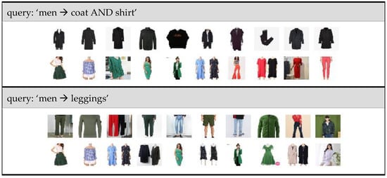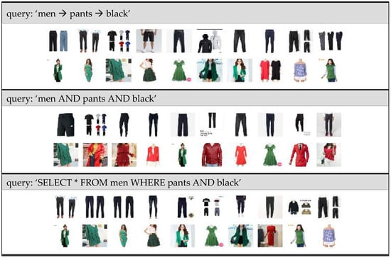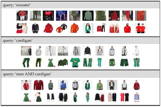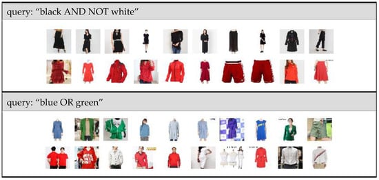 Figure 9, we checked whether meanings of AND, OR, and NOT were properly understood. First, in the case of “black AND NOT white” query, only fashion products with the white color were retrieved. Second, in the case of the OR operation, product images containing either blue or green were correctly retrieved. Similarly,